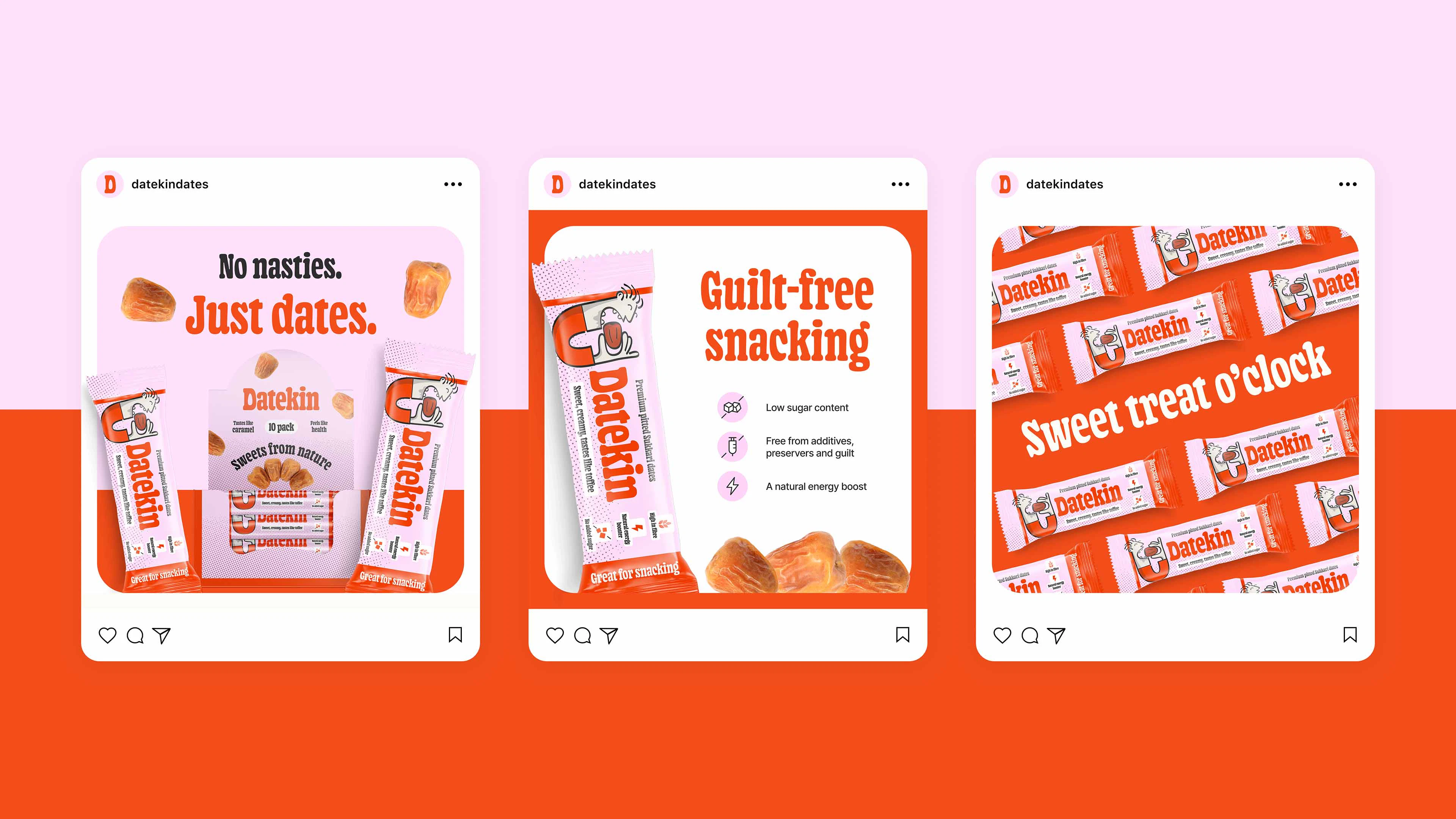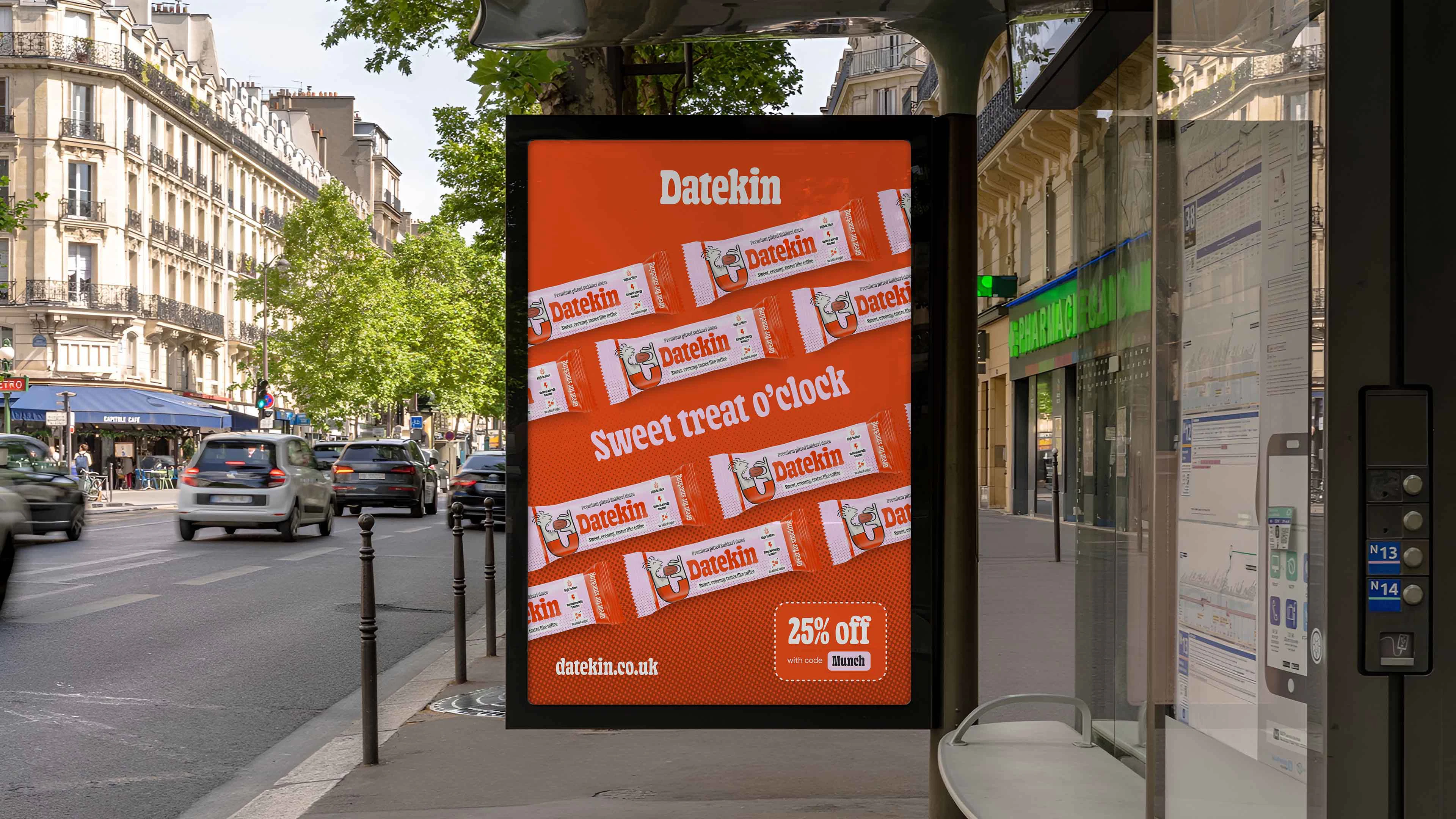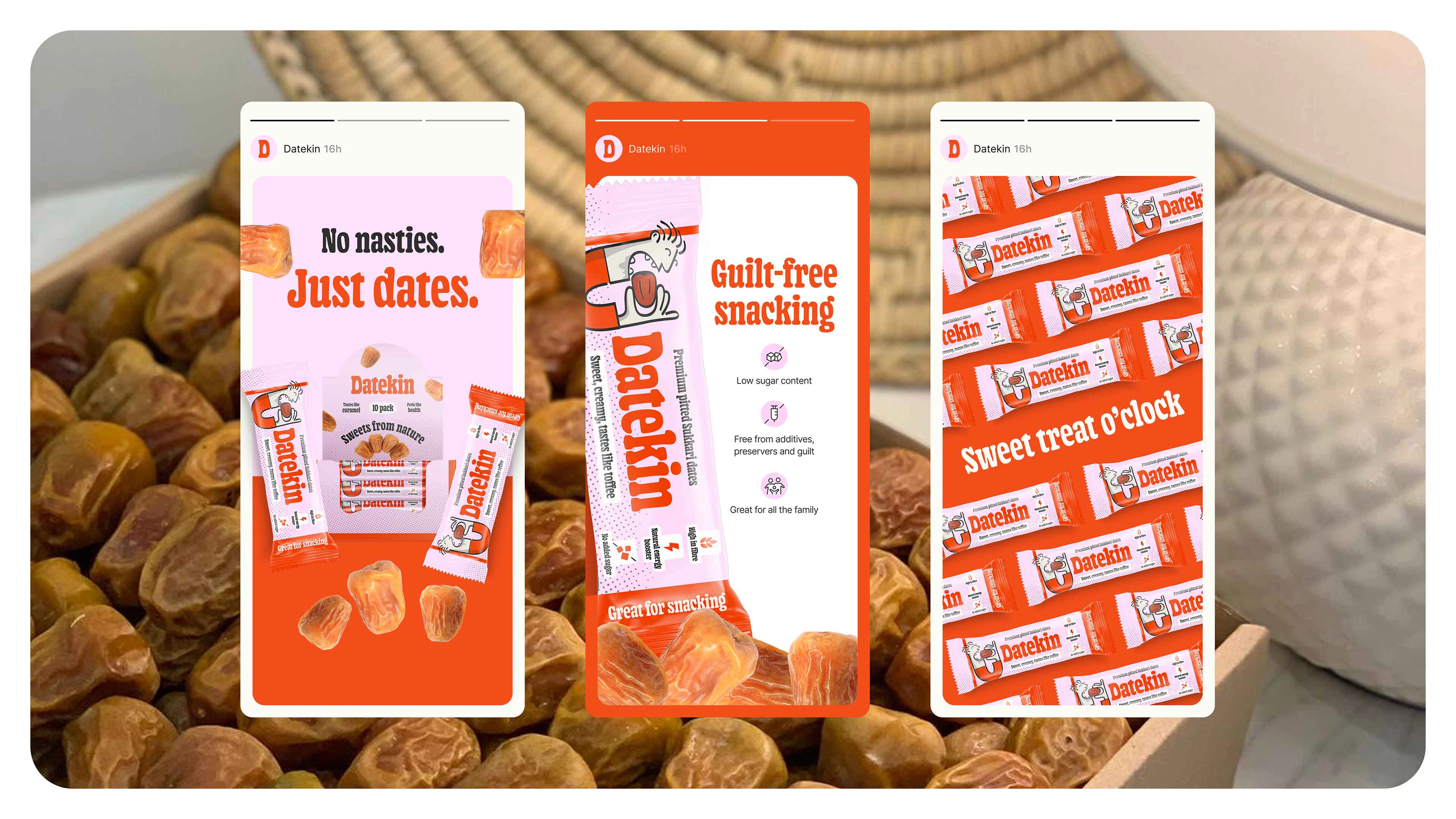 To bring this to life, we crafted a brand that feels as joyful and unpretentious as the product itself. The name “Datekin” is warm, friendly and a little cheeky - and the visual identity follows suit. Think playful nostalgia, candy-shop energy and tiny illustrated characters celebrating the magic of a really good date. Colour pops, charming packaging details and intuitive messaging make the experience feel fun, inviting and refreshingly straightforward. Every touchpoint leans into the idea that snacking shouldn’t require decoding - it should feel natural, vibrant and honestly delicious.